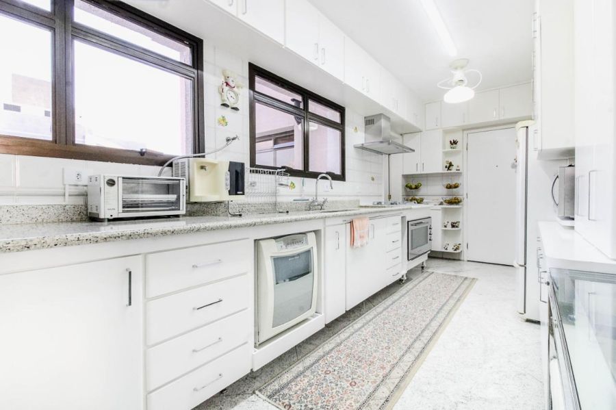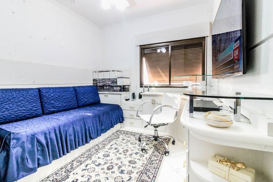 A planta é distribuída de forma inteligente, oferecendo quatro salas amplas que permitem múltiplos ambientes de convivência e recepção. A área íntima conta com três dormitórios, sendo uma suíte master, complementados por quatro banheiros e um lavabo. O imóvel é entregue semimobiliado, facilitando a transição para o novo proprietário.