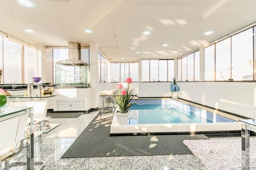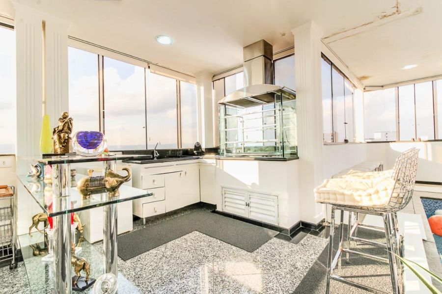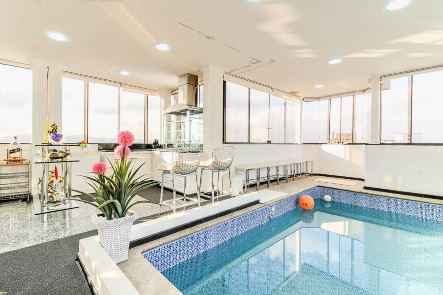 O pavimento superior é o grande diferencial desta unidade, apresentando uma área de lazer privativa completa com piscina aquecida e coberta e churrasqueira, emolduradas por uma vista panorâmica definitiva da cidade. A infraestrutura interna ainda dispõe de varanda, área de serviço, aquecimento de água central e conectividade via internet banda larga. Para a conveniência urbana, a unidade possui três vagas de garagem demarcadas.